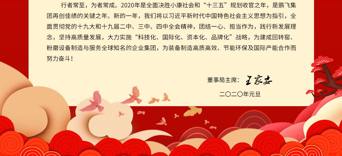 行者常至,為者常成。2020年是全面決勝小康社會和“十三五”規劃收官之年,是鵬飛集團再創佳績的關鍵之年。新的一年,我們將以習近平新時代中國特色社會主義思想為指引,全面貫徹黨的十九大和十九屆二中、三中、四中全會精神,團結一心、擔當作為,踐行新發展理念,堅持高質量發展,大力實施“科技化、國際化、資本化、品牌化”戰略,為建成回轉窯、粉磨設備制造與服務全球知名的企業集團,為裝備制造高質高效、節能環保及國際產能合作而努力奮斗!