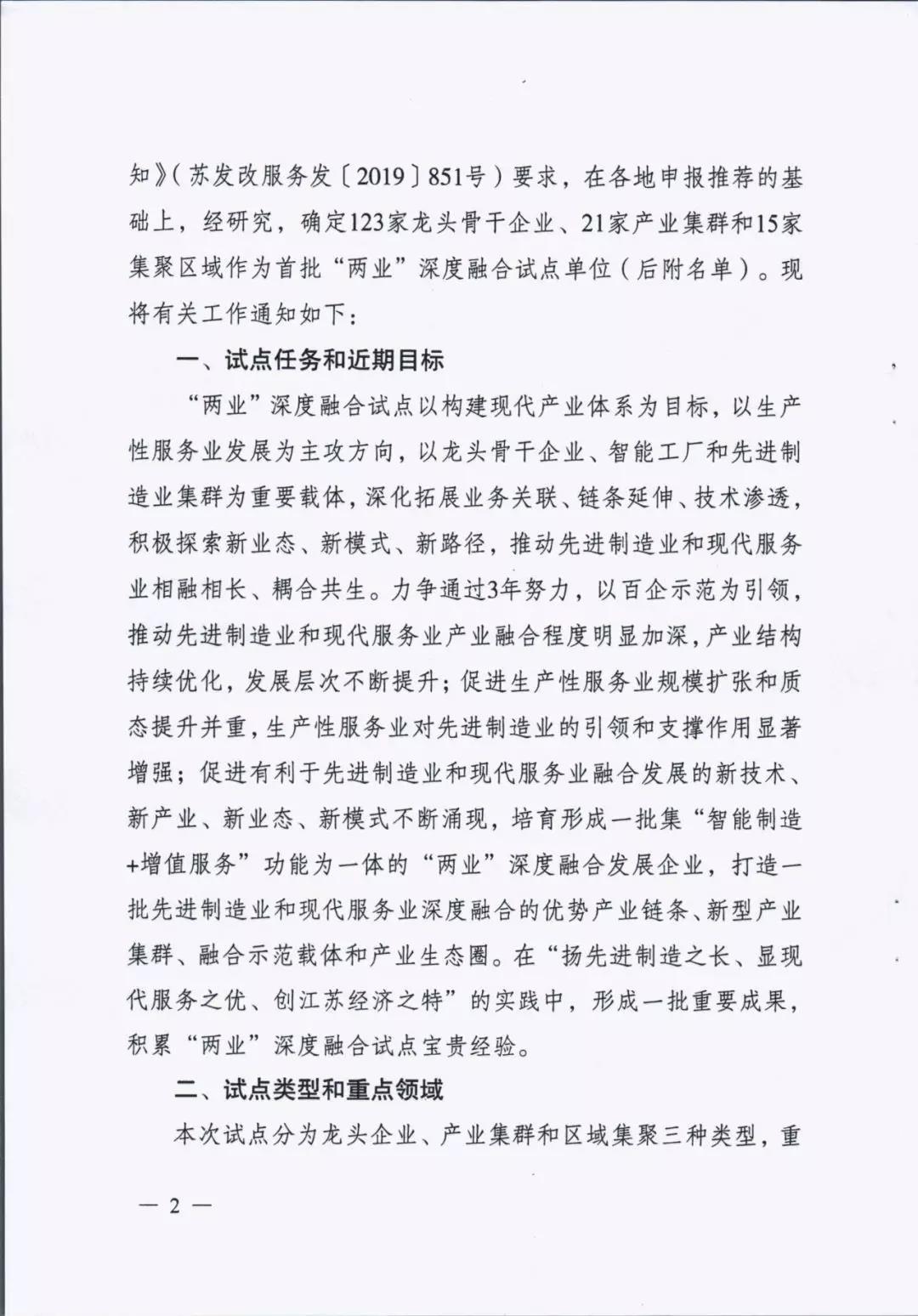 為貫徹落實中央深改委第十次會議精神、國家發改委等部門《關于推動先進制造業和現代服務業深度融合發展的實施意見》(發改產業〔2019〕1762號)和省委省政府部署要求,進一步推動先進制造業和現代服務業深度融合發展,我省啟動開展了江蘇省先進制造業和現代服務業深度融合試點推薦申報和遴選工作。根據《省發展改革委關于組織開展江蘇省先進制造業和現代服務業深度融合試點工作的通知》(蘇發改服務發〔2019〕851號)要求,在各地申報的基礎上研究確定123家龍頭骨干企業、21家產業集群和15家集聚區域作為首批“兩業”深度融合試點單位。我市江蘇鵬飛集團股份有限公司大型成套裝備總集成總承包融合試點、鑫緣繭絲綢集團股份有限公司繭絲綢全產業鏈產品生命周期管理融合試點、中國天楹股份有限公司智慧城市環境管理系統應用總集成總承包融合試點共三家企業入選試點名單。