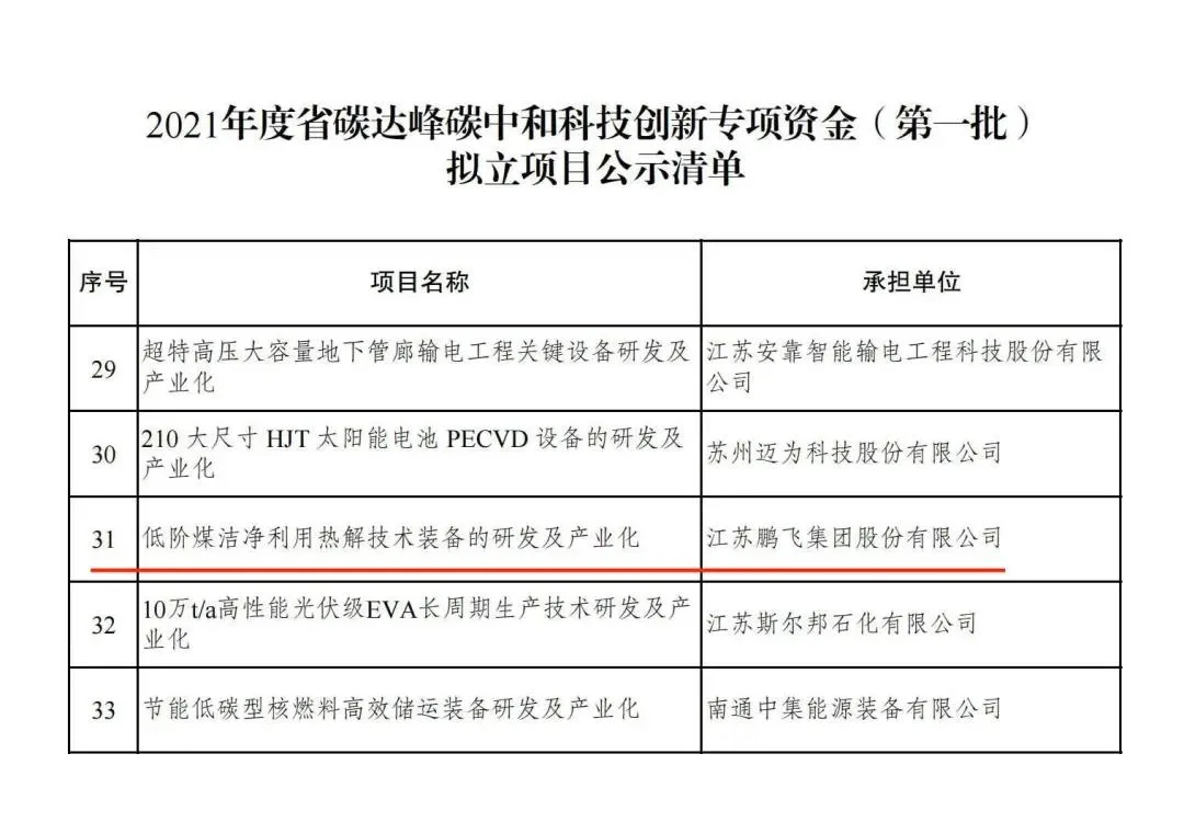 近日,江蘇省科技廳發(fā)布《2021年度省碳達(dá)峰碳中和科技創(chuàng)新專項(xiàng)資金(第一批)擬立項(xiàng)目公示》。座落于江蘇海安的鵬飛集團(tuán)股份有限公司的“低階煤潔凈利用熱解技術(shù)裝備的研發(fā)及產(chǎn)業(yè)化”項(xiàng)目獲立項(xiàng)公示。利用回轉(zhuǎn)窯熱解技術(shù)進(jìn)行低階煤提質(zhì)清潔利用屬國內(nèi)首創(chuàng),項(xiàng)目已獲授權(quán)發(fā)明ZL10件、實(shí)用新型ZL9件。