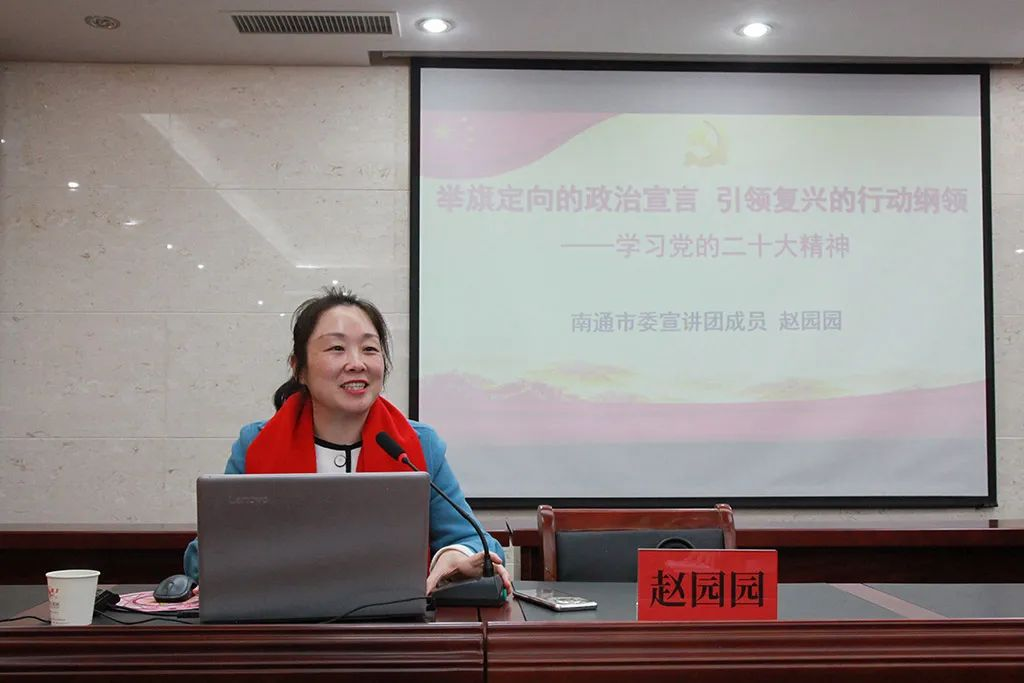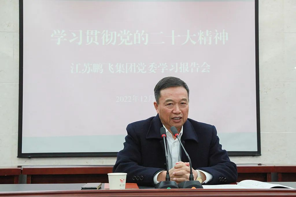 近日,深入推進學習宣傳貫徹黨的二十大精神在鵬飛集團蔚然成風,12月7日下午,南通市委宣講團成員,南通市委黨校副校長、教授趙園園走進鵬飛,來公司開展學習貫徹黨的二十大精神專題宣講,進一步引導鵬飛人把思想和行動統(tǒng)一到黨的二十大精神上來。鵬飛集團在新征程上用黨的創(chuàng)新理論武裝頭腦、指導實踐、推動工作,更好地“扛起新使命、譜寫新篇章”,以實際行動和過硬成果推動黨的二十大精神落地見效。大公鎮(zhèn)黨委書記金山存、黨委副書記閻超、宣傳委員徐譯,鵬飛集團黨委書記、董事長王家安等認真聽取了宣講內(nèi)容,經(jīng)發(fā)局全體人員、鵬飛集團全體負責人、工人代表等參加專題學習。