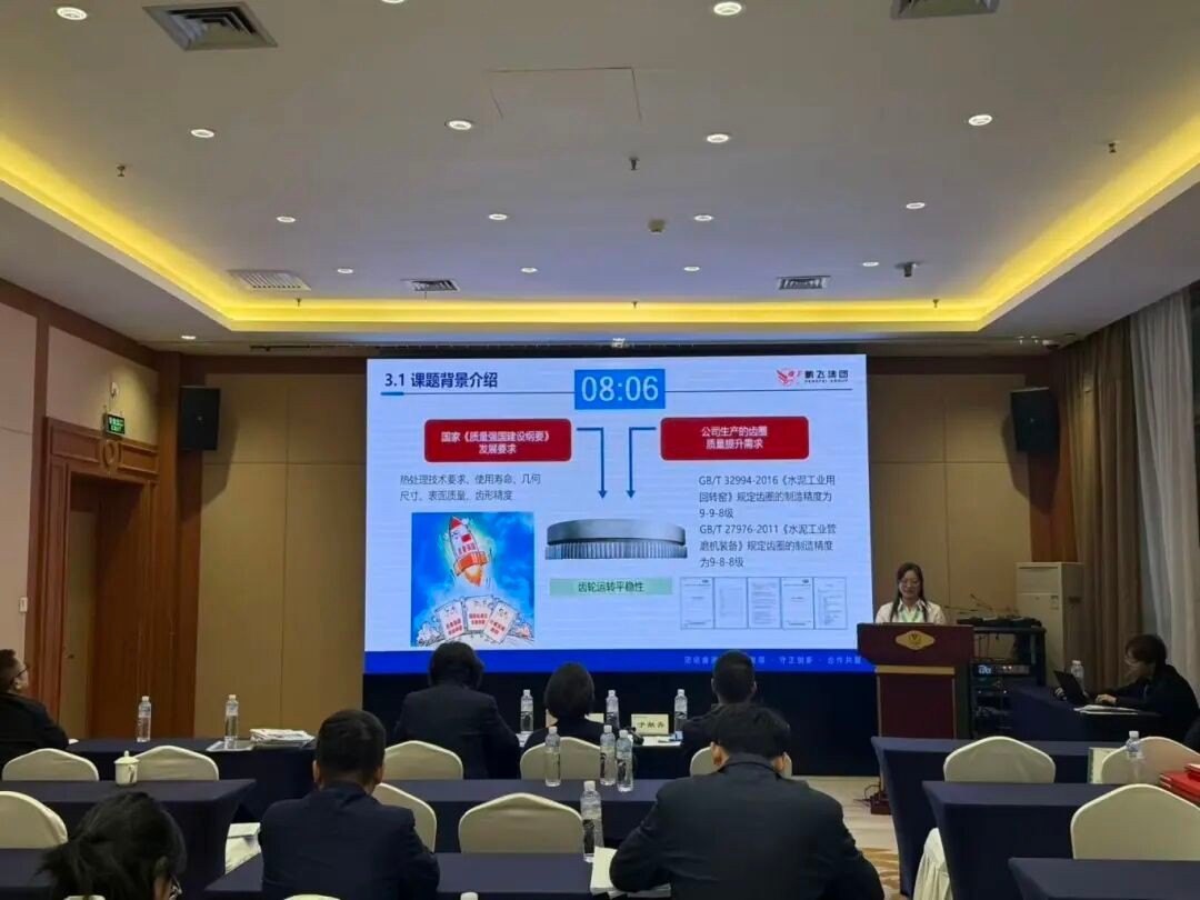 鵬飛金工QC小組發(fā)表成果《提高陽極爐齒圈和滾圈傳動連體一次加工合格率》。金工大齒輪組圍繞陽極爐齒圈和滾圈轉動連體加工中的變形和精度等問題,展開此次QC小組活動。小組利用創(chuàng)新工法的制定與實施,不僅提升了一次加工合格率18.2%,縮短了加工周期,還保障了產(chǎn)品的穩(wěn)定性,節(jié)約了成本。
