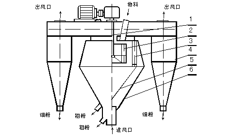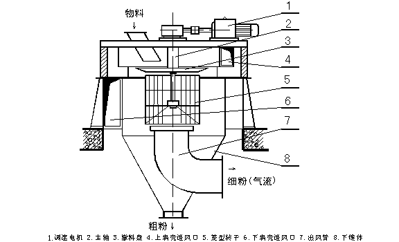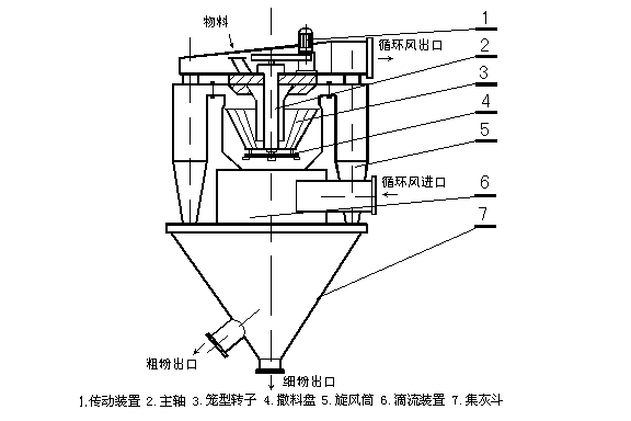 由傳動裝置、回轉(zhuǎn)部分(主軸、撒料盤、轉(zhuǎn)子等),機殼(內(nèi)筒、導(dǎo)向葉片、內(nèi)錐體、外筒、外錐體、進風(fēng)口、加料口、兩個粗粉出口等),細粉收集裝置(四個旋風(fēng)筒等)組成。