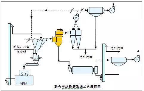 此工藝運(yùn)用于VPM立磨功率與球磨機(jī)功率比值大于0.5的場(chǎng)合,該系統(tǒng)主要優(yōu)點(diǎn)是系統(tǒng)產(chǎn)量高(增產(chǎn)100%以上),單位電耗低。