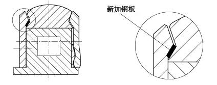 骨架密封厚度15mm,拆下壓蓋用車床將骨架密封擋邊車薄5mm,壓蓋密封槽深度由18mm加深到23mm(見(jiàn)圖4)。此法使得骨架密封在高速軸上的安裝位置向外移動(dòng)5mm,避開(kāi)高速軸上的溝槽。經(jīng)此處理,解決了漏油問(wèn)題,可以正常生產(chǎn),等到計(jì)劃?rùn)z修停機(jī)時(shí),再?gòu)氐滋幚砀咚佥S上的溝槽。