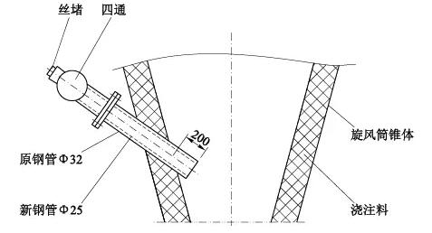 拆下四通及法蘭,在Φ32鋼管內(nèi)部套裝Φ25鋼管,Φ25鋼管上端與法蘭焊接,下端與原Φ32筒平齊(見(jiàn)圖5)。這樣處理后,預(yù)熱器C5B旋風(fēng)筒負(fù)壓正常。