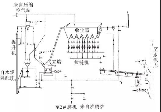 生產P·O42.5水泥時工藝流程是:熟料、石膏、石灰石、粉煤灰、礦渣等物料經輸送設備輸送至各配料倉,粉煤灰從粉煤灰庫下經輸送設備進入生產系統。各種物料按一定比例設定,分別經各定量給料機和輸送設備送至入磨鎖風閥后入磨。入磨物料在磨內進行烘干和粉磨,粉磨后的物料經選粉機分離,粗粉返回磨盤重新粉磨,合格細粉隨氣流直接進入袋式收塵器進行收集,收集下來的成品經空氣斜槽、斗式提升機等輸送設備入水泥庫儲存;立磨吐渣經輸送設備(設有除鐵器)進入循環斗式提升機,提升入磨后繼續粉磨。沸騰爐提供的熱風與循環風、冷風混合后進入磨內,磨內混合風起到烘干和提升物料的作用,出磨氣流進入布袋收塵器;出布袋收塵器的氣體經循環風機后一部分經循環風管,作為循環風入磨,其余氣體經煙囪排入大氣。系統工藝流程見圖1。